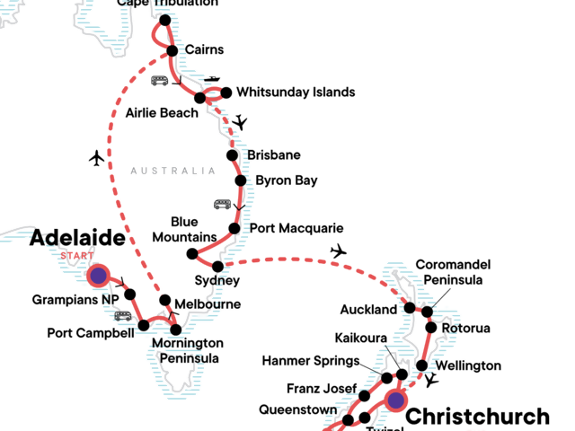 Experience Melbourne’s colourful laneways, Travel along the Great Ocean Road and look out for the 12 Apostles, Hike in Grampians National Park, Follow an Indigenous guide through the Daintree Rainforest, Spend the day boating around the scenic Whitsundays, Stay overnight in the Blue Mountains, Cruise around the fjords of Doubtful Sound in Fiordland National Park, Soak in the scenery of Aoraki/Mt Cook National Park, Experience traditional Maori culture
